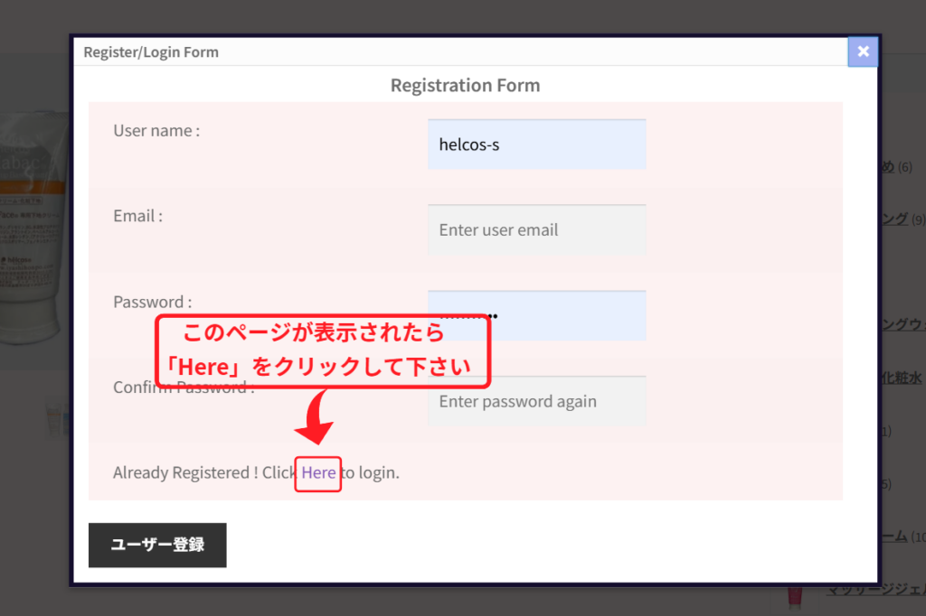 ログイン 既存ユーザのログインユーザー名またはメールアドレスパスワードボットではないことを証明してください6 + 2 = ログイン状態を保存する パスワードを忘れた場合 パスワードリセットはじめての方はこちら 新規ユーザー登録 ◇商品ページ、お買い物かごからのログイン 商品ページ・お買い物かごからログインした場合、以下の画面が表示されることがあります。画像を参考に「Here」をクリックしてお進みください。