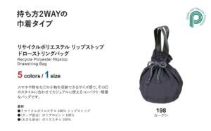 リサイクルポリエステルを使用したドローストリングバッグは、スマホや財布などの小物を収納できるサイズ感で、その日のスタイルに合わせてカジュアルに使えるコンパクト・軽量なバッグです。